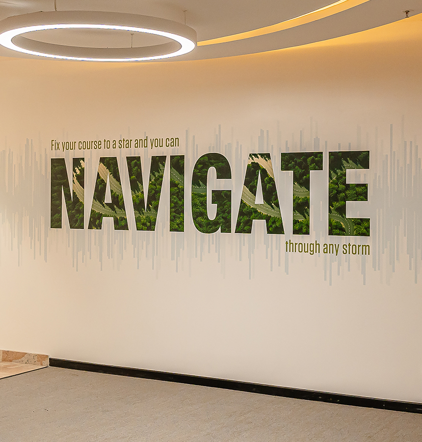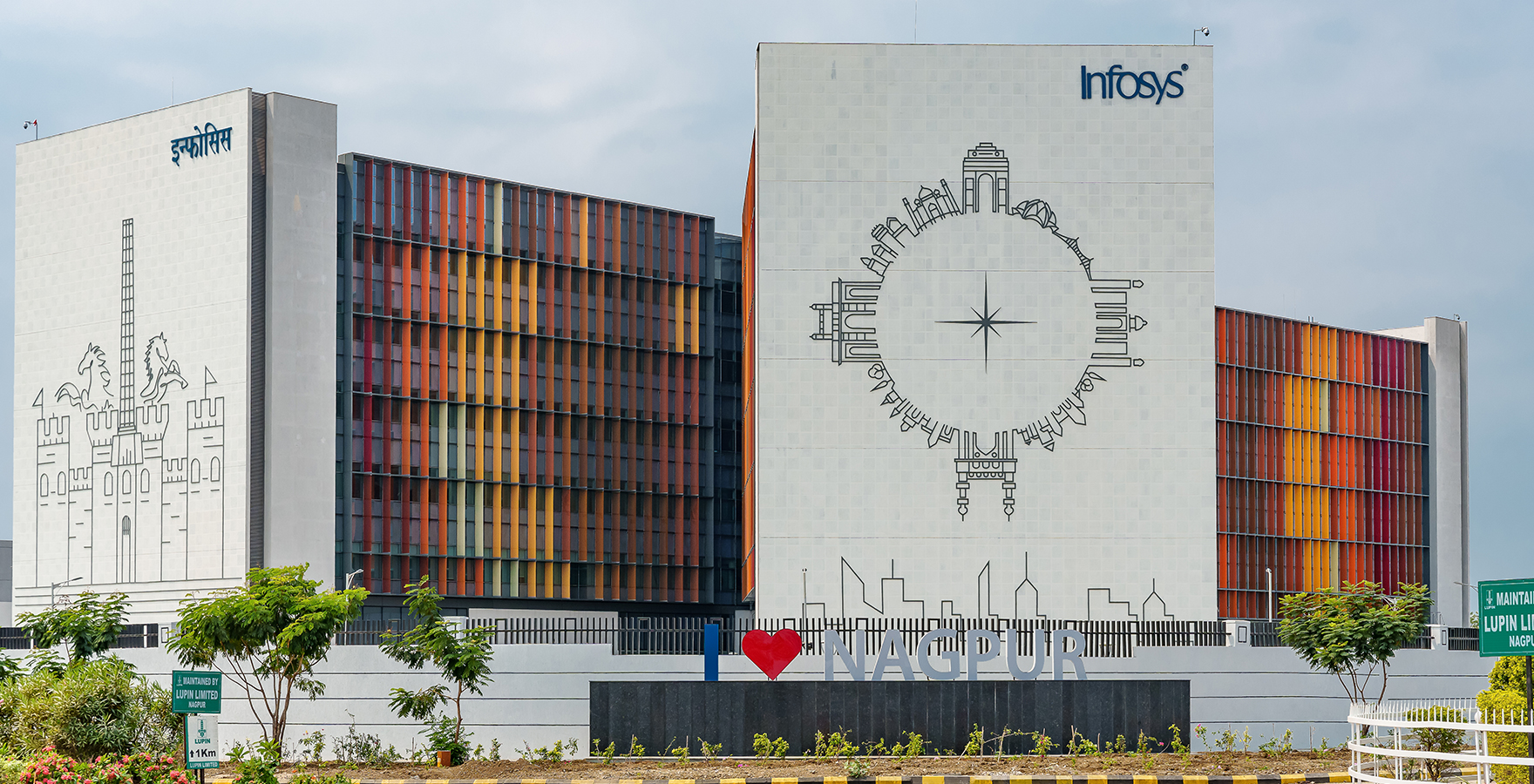 For Infosys Nagpur, we faced the challenge of creating four illustrative designs for a 100-foot-tall building façade. Nagpur, the center of India, is rich in heritage, and our designs reflect its role as a global development hub.